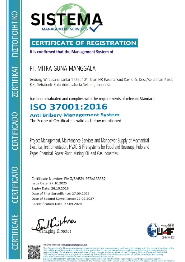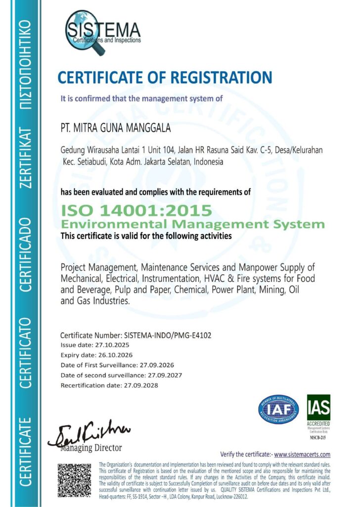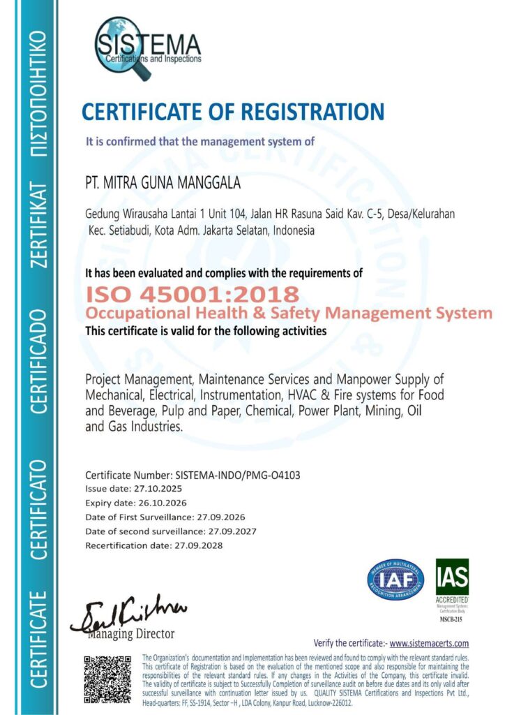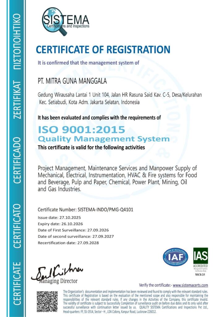 Our Certificates ISO KAMI Kami menyediakan layanan konstruksi, maintenance, dan penyediaan tenaga kerja dengan kualitas dan presisi terbaik Click here to change this text. PT Mitra Guna Manggala is a trusted partner that prioritizes quality, safety, and timeliness in every project. Contact us